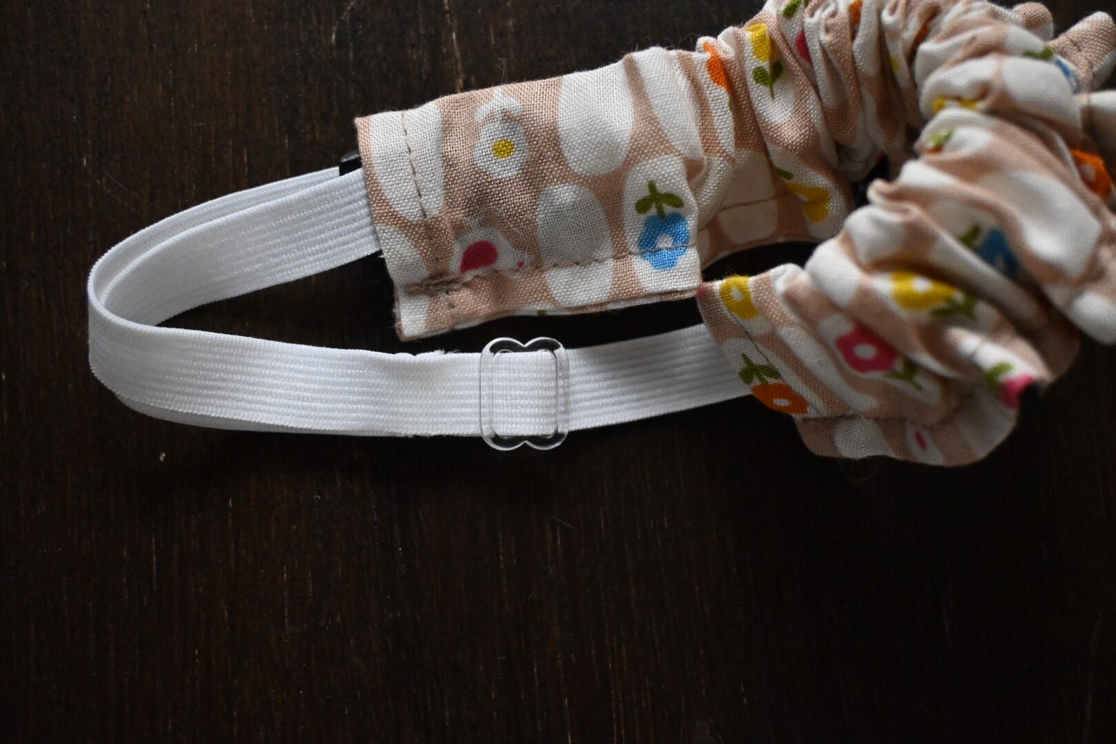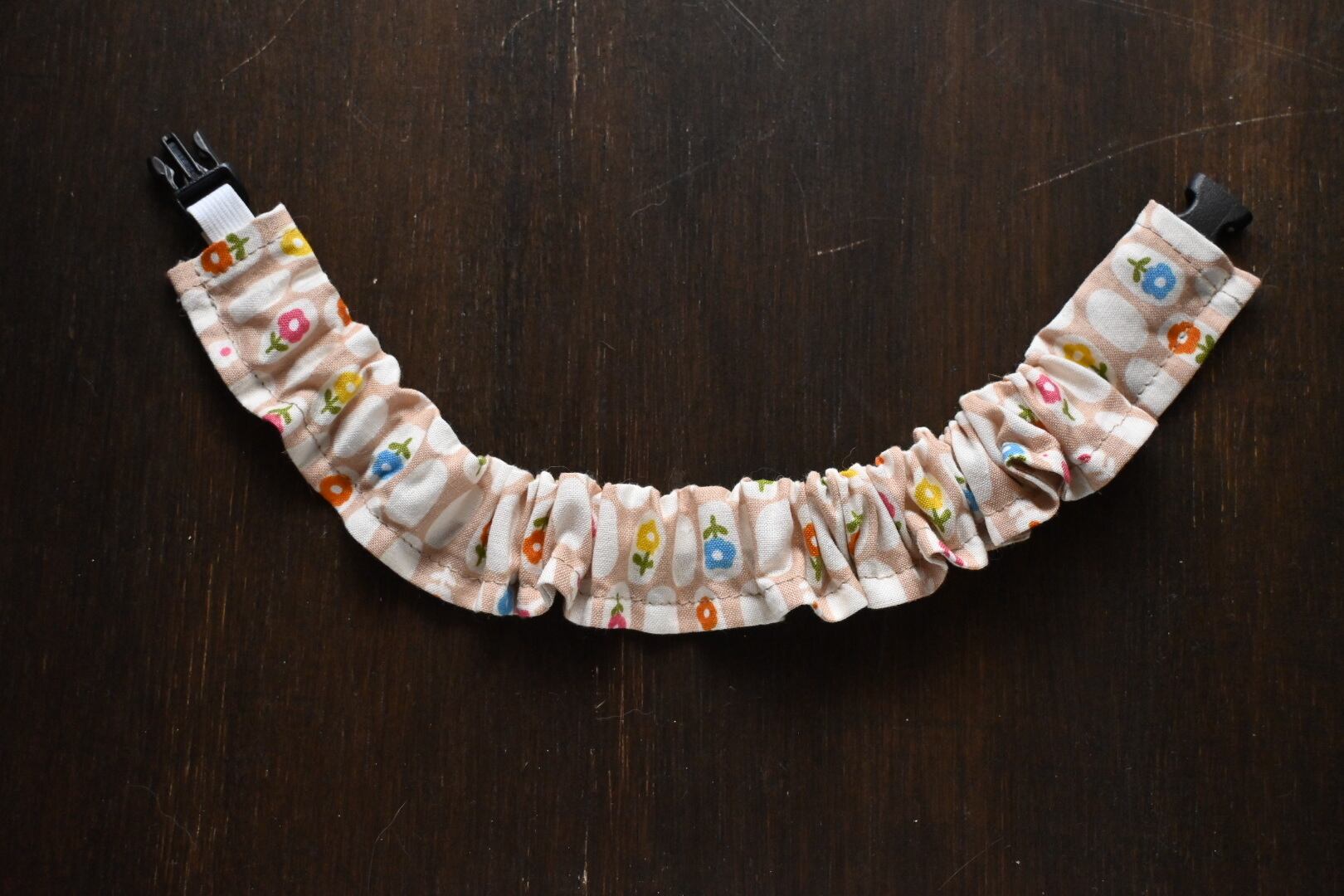 ②1度ゴム首輪を取り出していただき、猫ちゃんの首輪にサイズに合わせてからフリル首輪に通していただく(その場合はクリップなど適宜ご準備ください)