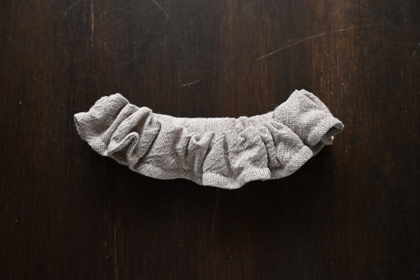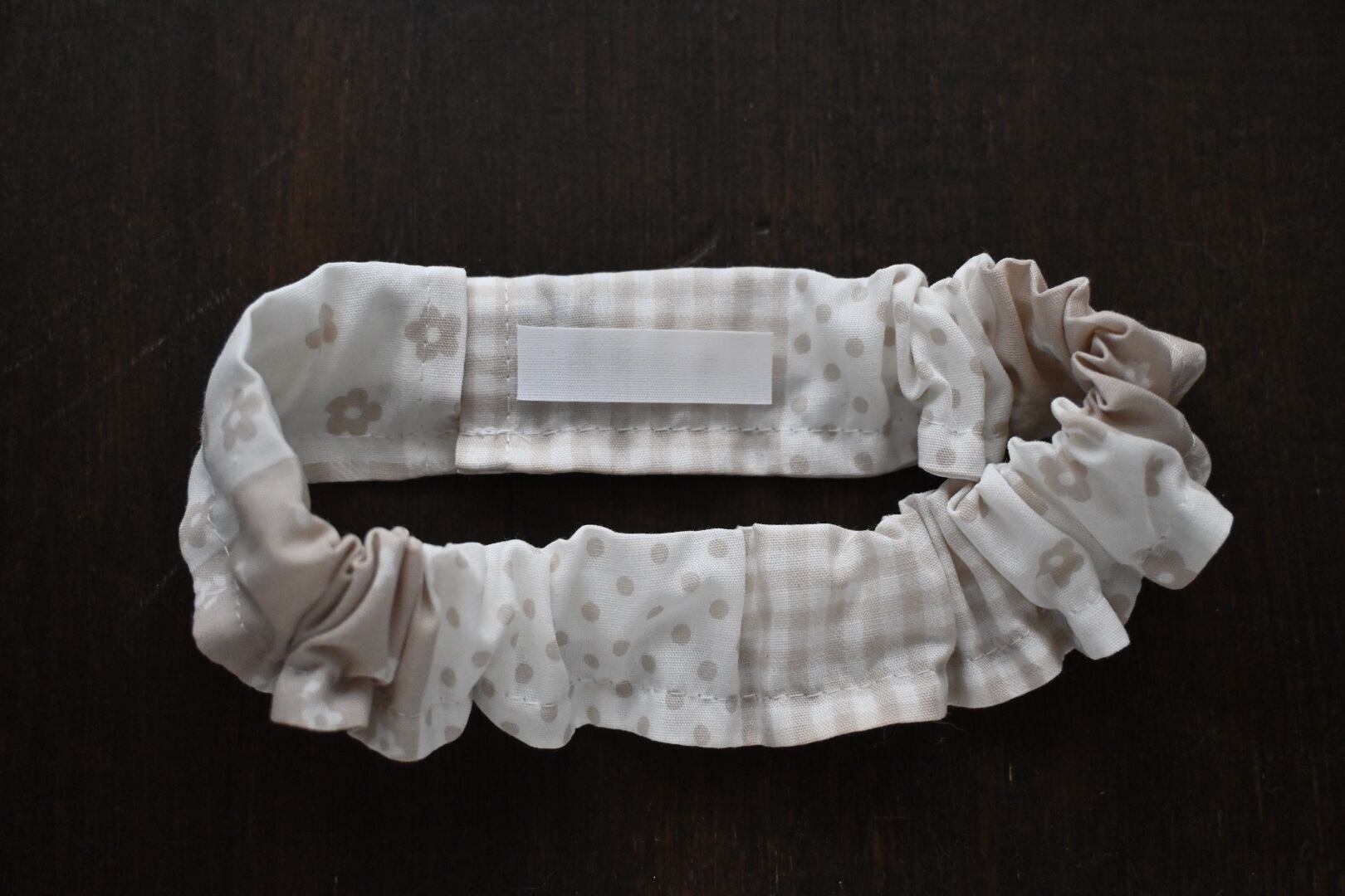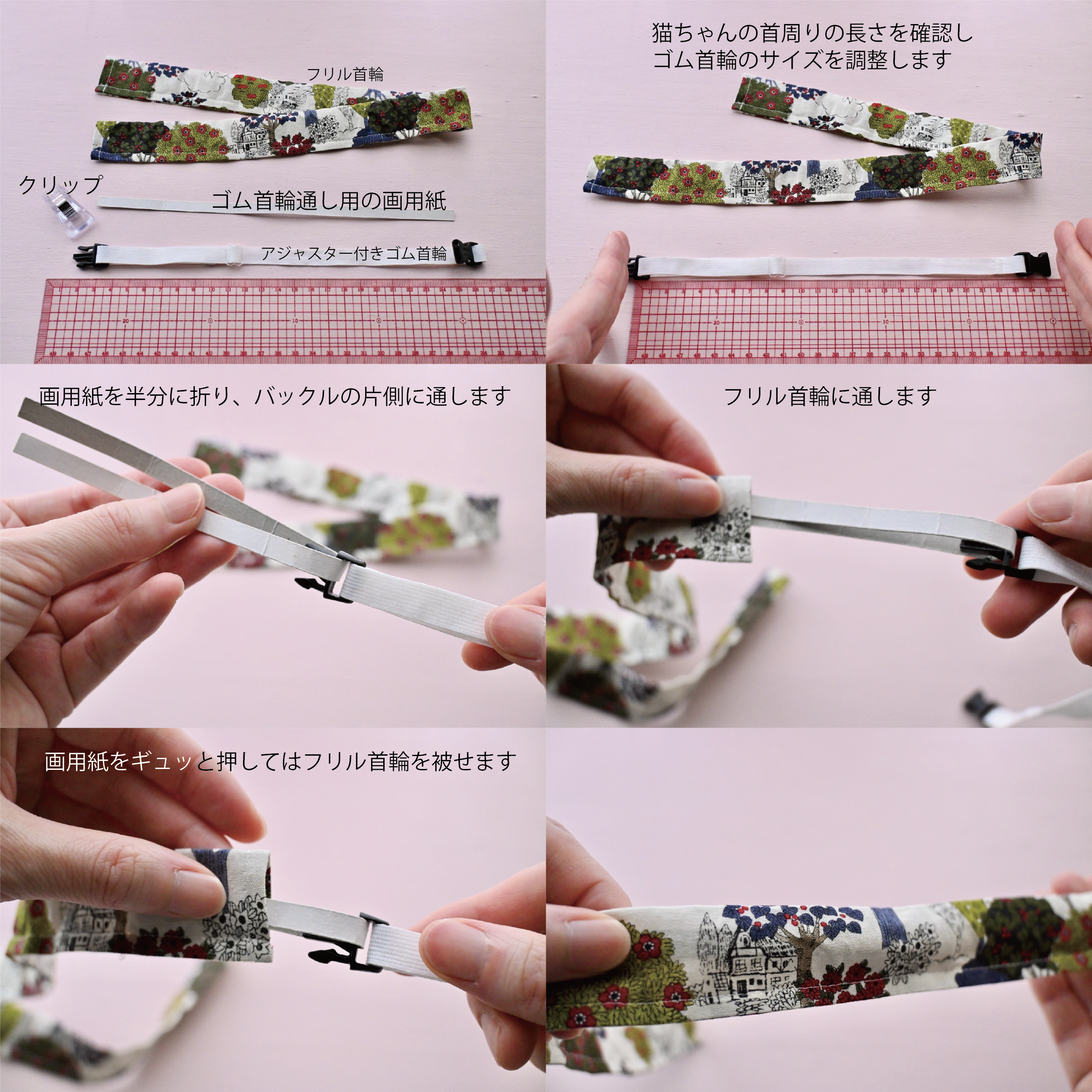 ②1度ゴム首輪を取り出していただき、猫ちゃんの首輪にサイズに合わせてからフリル首輪に通していただく(その場合はクリップなど適宜ご準備ください)