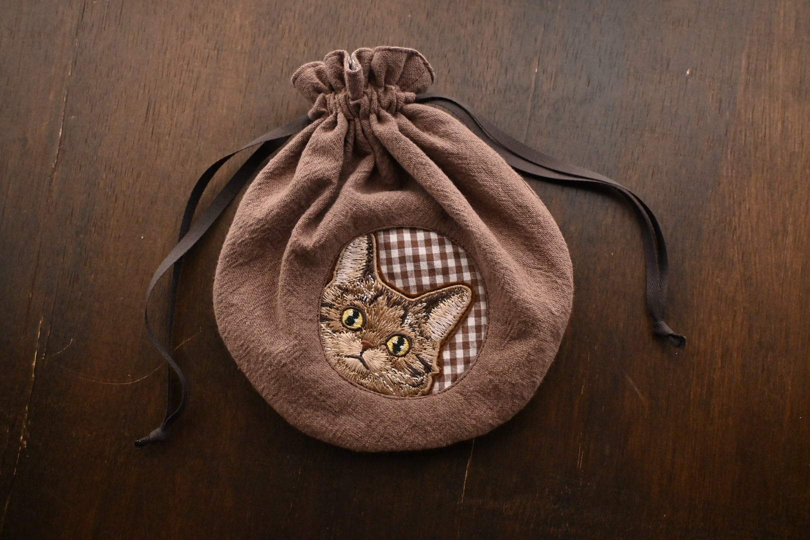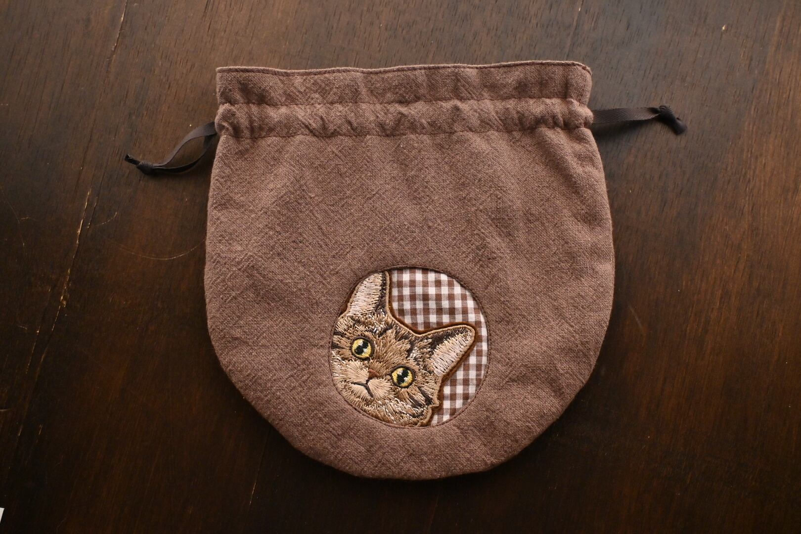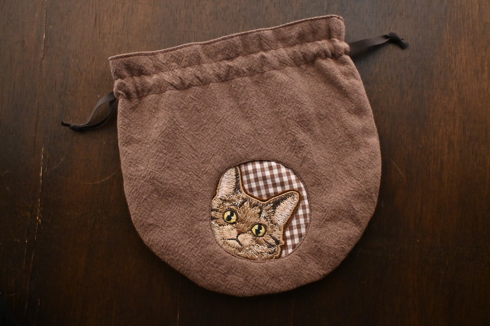 刺繍猫ちゃんの丸い穴からのぞく巾着をつくりました。