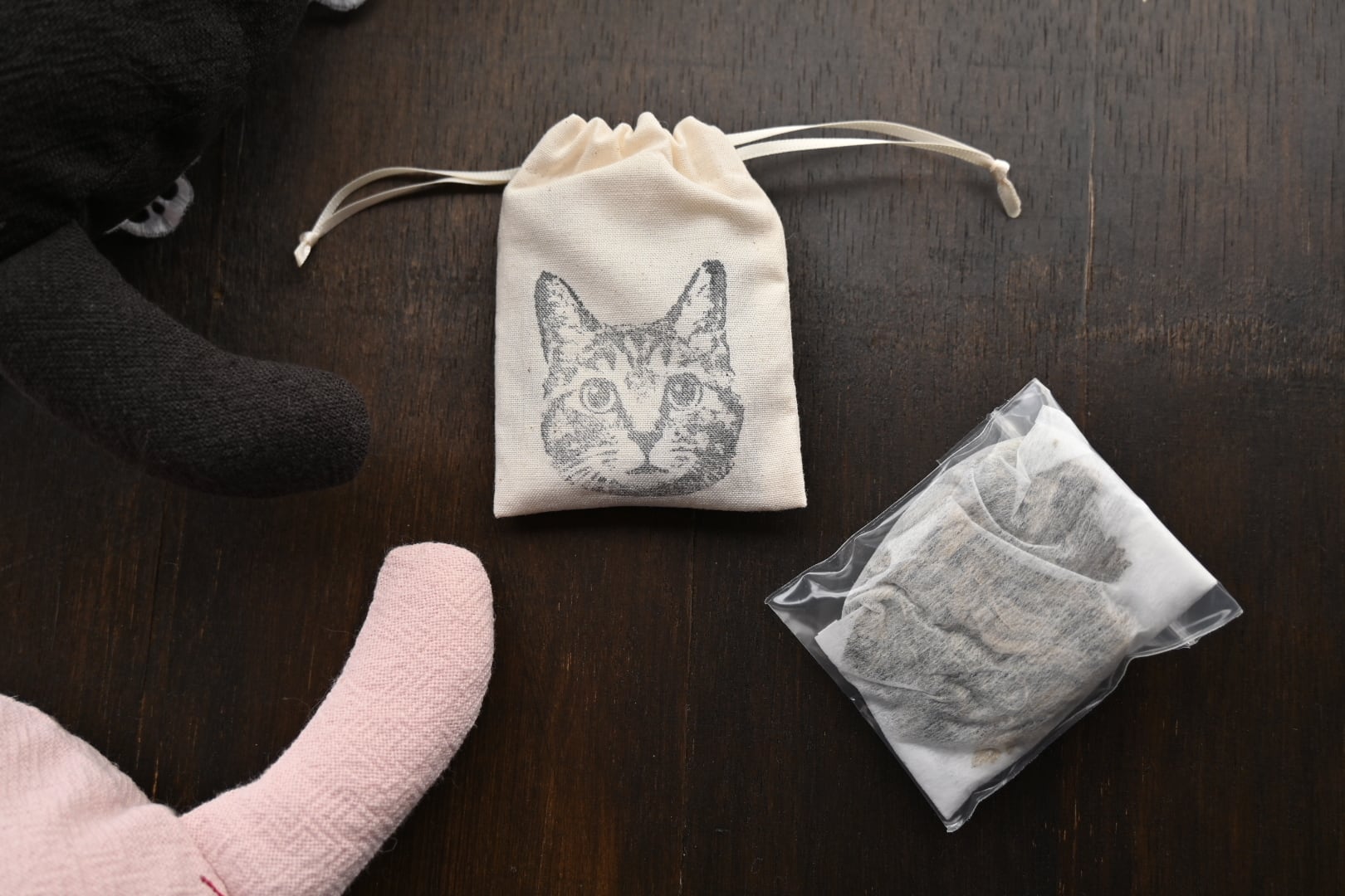 ・完全無農薬の自家製のキャットニップを乾燥させ、不織布のバッグに詰め、ジップロックに保存しています。本品は猫ちゃん用まくらとして制作しておりますが、猫ちゃんの興味をひきたい時に、不織布のバッグごとキャットニップをジップロックから取り出して揉み込み、巾着の中に戻し、まくらに軽く匂いがつくように、キャットニップとまくらを一緒に引き出しの中などで一度保管してください。